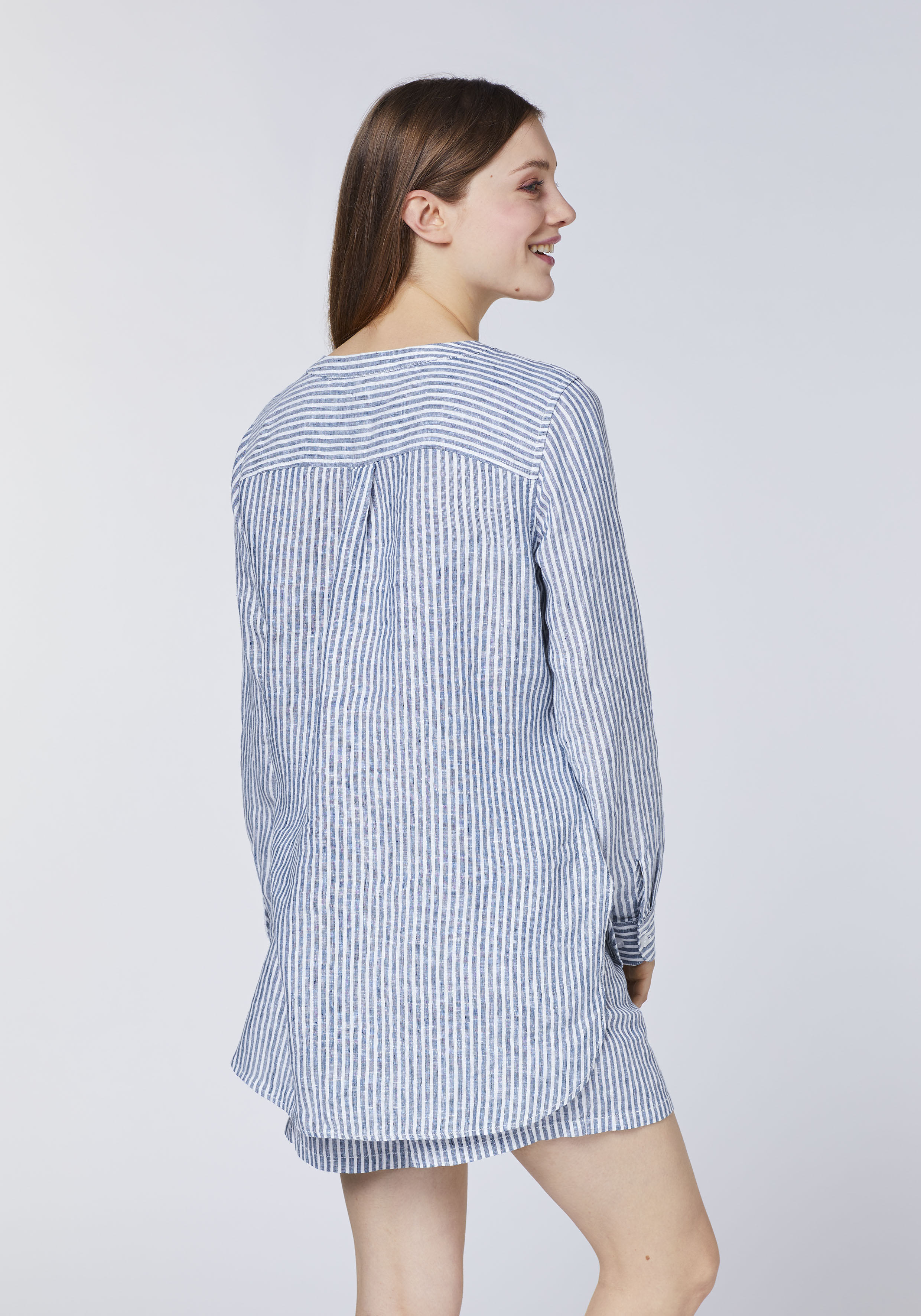 Die leger geschnittene POLO SYLT Damen-Bluse aus purem Leinen zelebriert den Clean-Chic wie kaum eine andere. Feine Streifen, ein dezenter Label-Akzent und eine rückseitige Falte betonen das sonst schlicht gehaltene Design. Der High-Low-Saum und die Seitenschlitze verleihen der Streifenbluse von POLO SYLT ein modernes Finish.