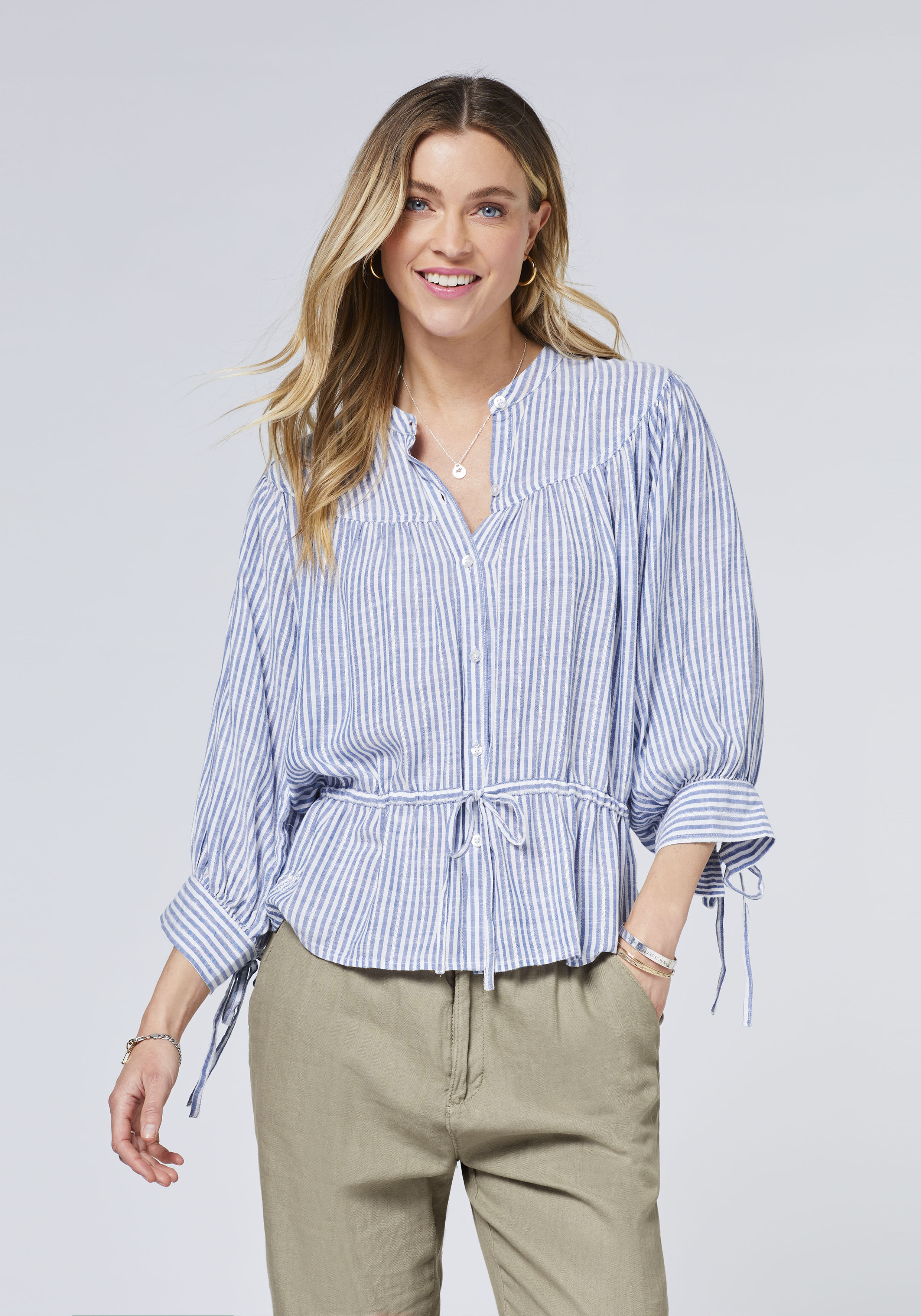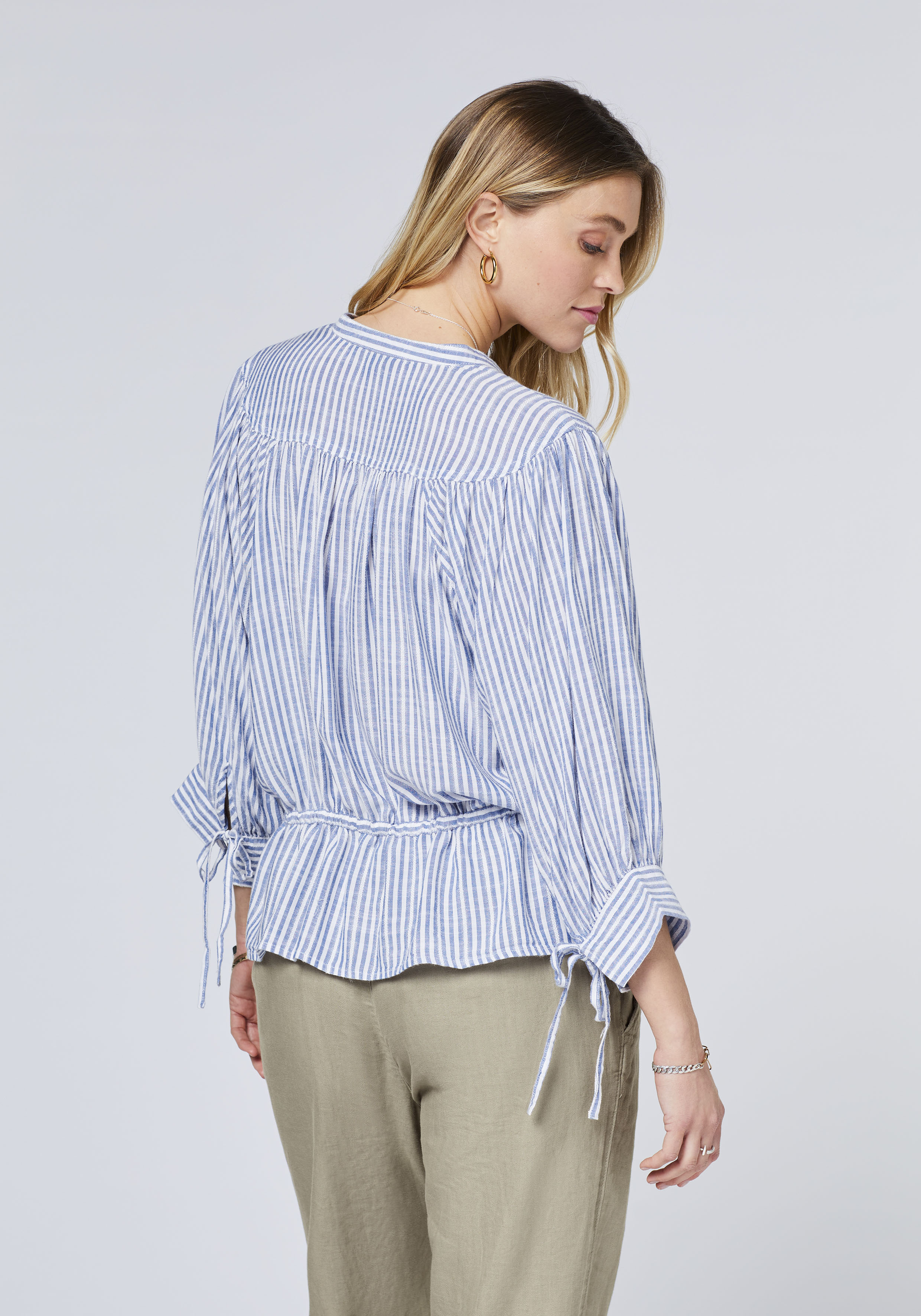 POLO SYLT hat die Damen-Bluse für diese Saison modern neu interpretiert. Die Kombination aus dezentem Streifenmuster, effektvoll tailliertem Schnitt und dekorativen Falten verleiht ihr eine ganz besondere Optik. Dank der Viskose-Mischung ist der feminine Casual-Style so schön leicht. Zudem zeigt sich die POLO SYLT Bluse mit einer Naht unterhalb des Kragens und drei Bändchen, die für noch mehr modische Raffinesse stehen.